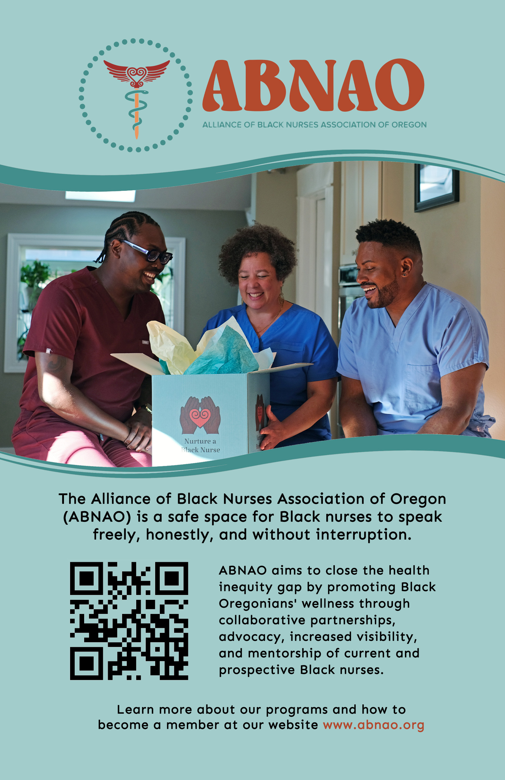 The Alliance of Black Nurses Association of Oregon (ABNAO) aims to close the health inequity gap by promoting Black Oregonians’ wellness through collaborative partnerships, advocacy, increased visibility, and mentorship of current and prospective Black nurses.